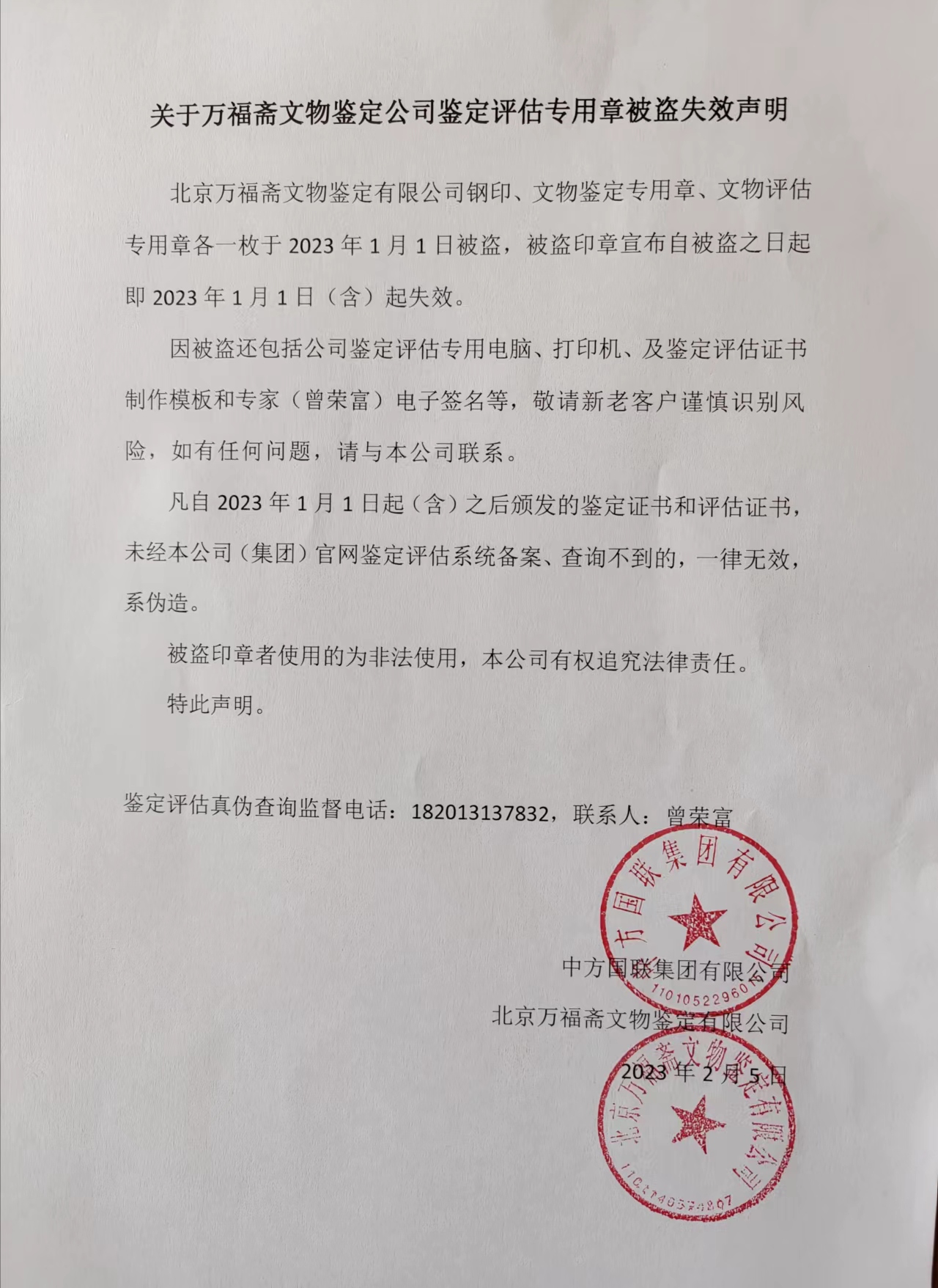 北京万福斋文物鉴定有限公司钢印、文物鉴定专用章、文物评估专用章各一枚于2023年1月1日被盗,被盗印章自被盗之日起即2023年1月1日(含)起失效。