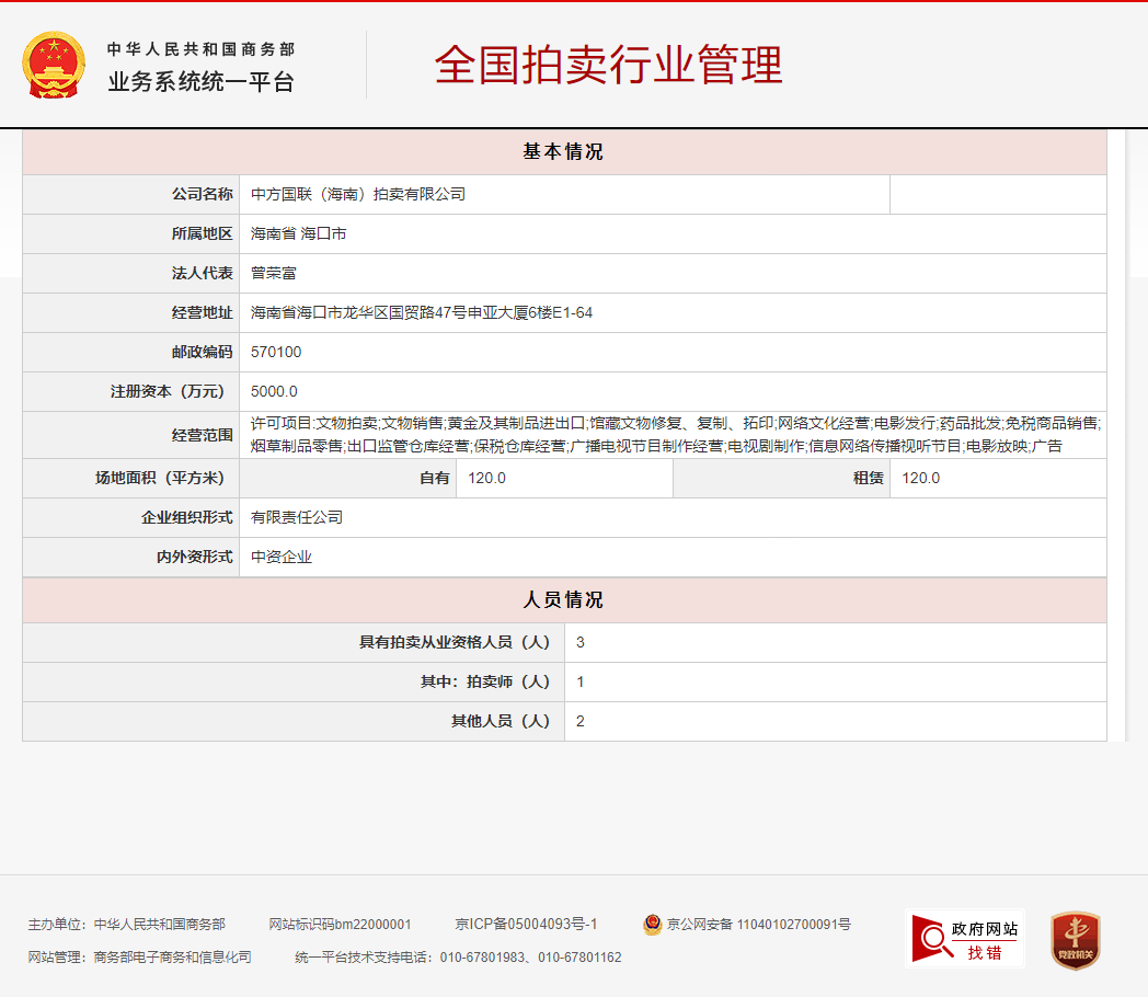 中方国联(海南)拍卖有限公司取得文物拍卖、文物销售备案许可号:4602911100002023,经营经营范围:许可项目:文物拍卖;文物销售;黄金及其制品进出口;馆藏文物修复、复制、拓印;网络文化经营;电影发行;药品批发;免税商品销售;烟草制品零售;出口监管仓库经营;保税仓库经营;广播电视节目制作经营;电视剧制作;信息网络传播视听节目;电影放映;广告发布(依法须经批准的项目,经相关部门批准后方可开展经营活动)一般项目:艺(美)术品、收藏品鉴定评估服务;珠宝首饰批发;艺术品代理;寄卖服务;珠宝首饰零售;酒店管理;餐饮管理;医院管理;技术服务、技术开发、技术咨询、技术交流、技术转让、技术推广;电影摄制服务;文艺创作;资产评估;广告设计、代理;广告制作;安全系统监控服务;音响设备制造。