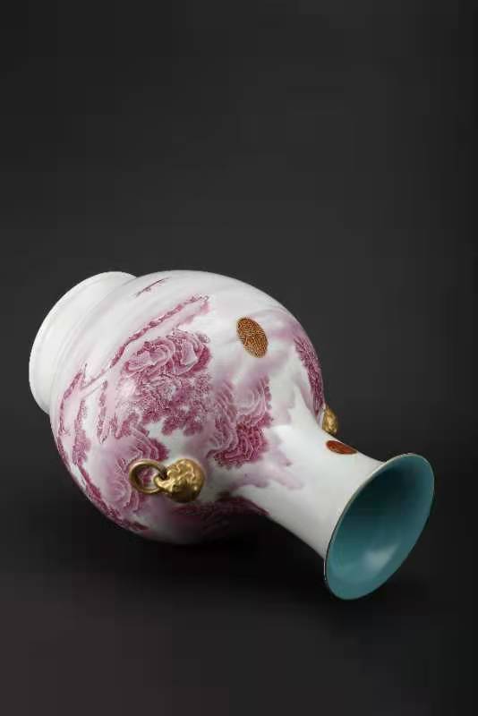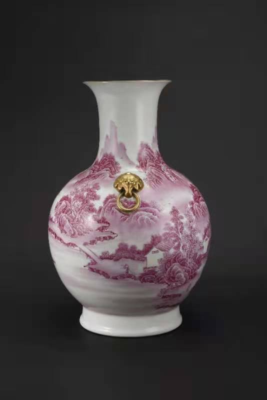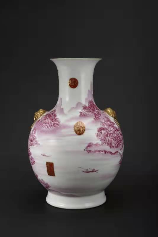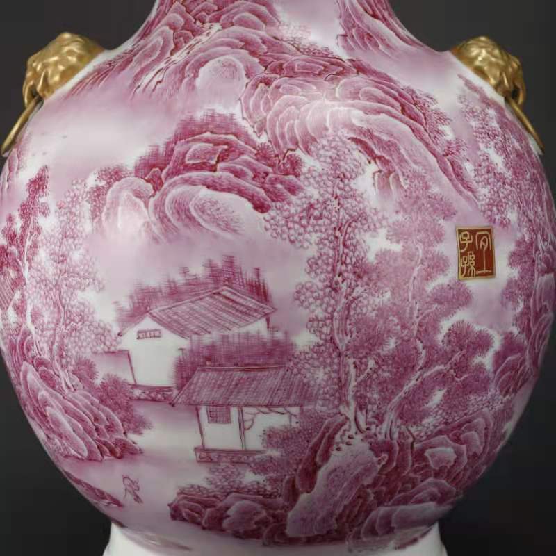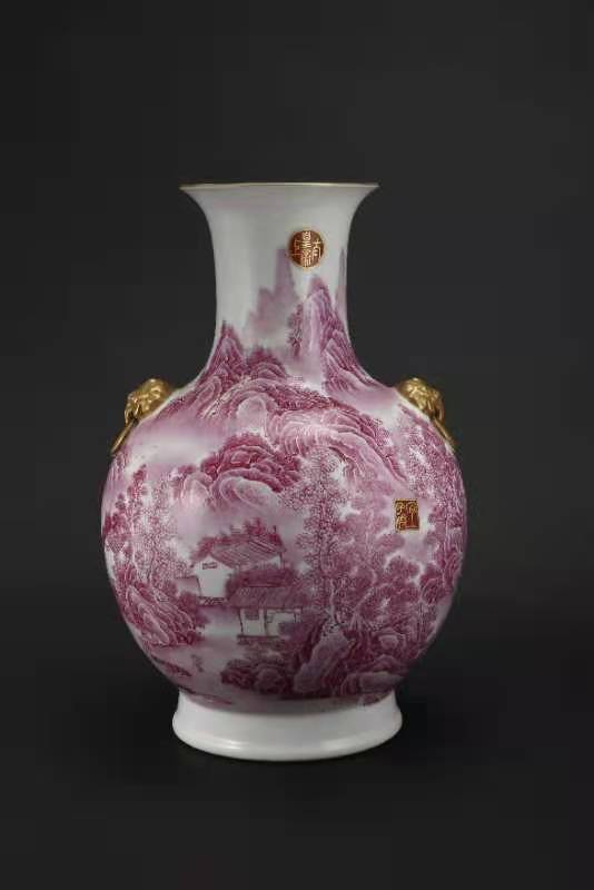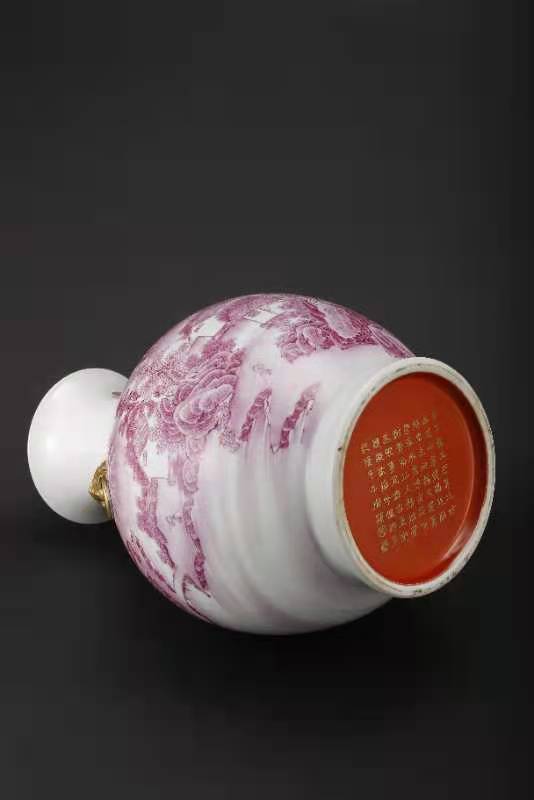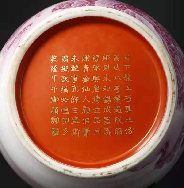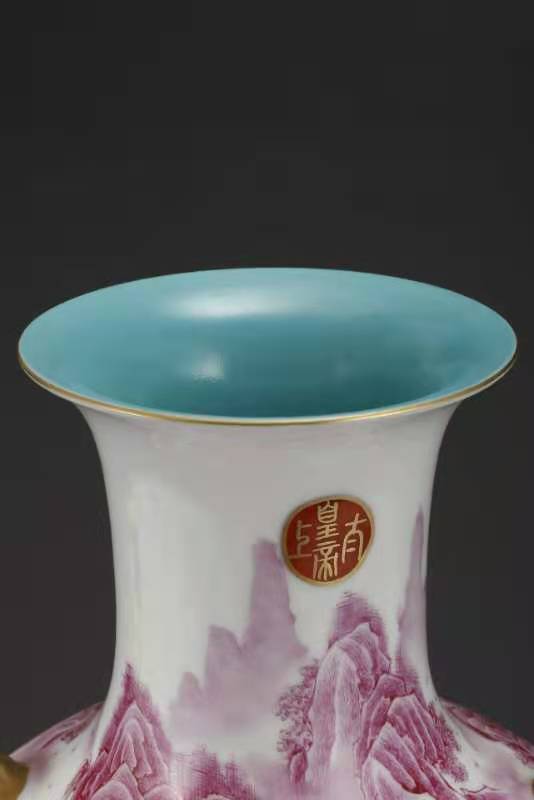 016.大清乾隆年制胭脂红珐琅山水楼阁人物描金兽耳尊。该尊用胭脂红釉绘山水人物楼阁,描金书写印太上皇帝、宜子孙、古稀天子、乾隆御览之宝、三希堂精鉴玺。口沿兽耳描金,绿里绿地,底部有描金乾隆御题诗。该尊器型大气厚重,画工精美。是件很珍贵的馆藏文物首选。该尊高45厘米,口径16.3厘米,底径20.3厘米。