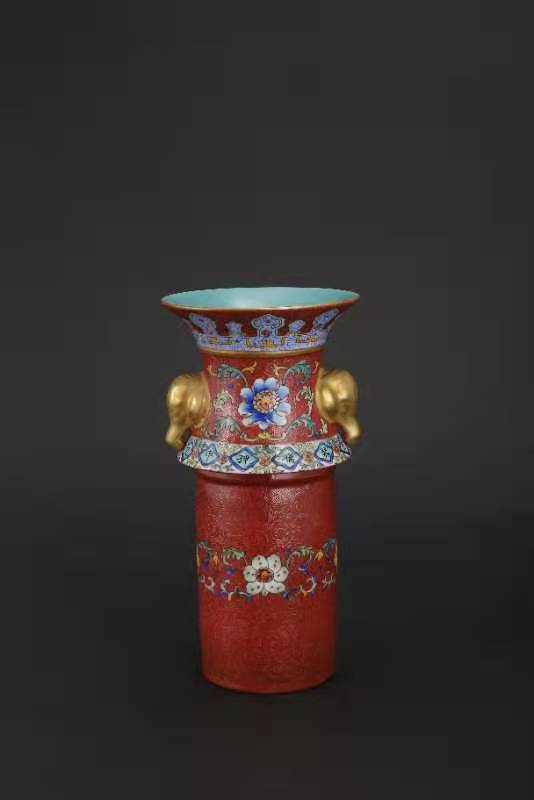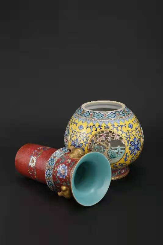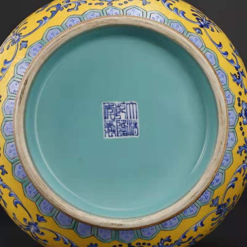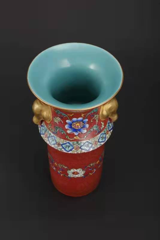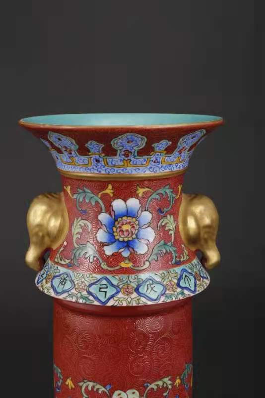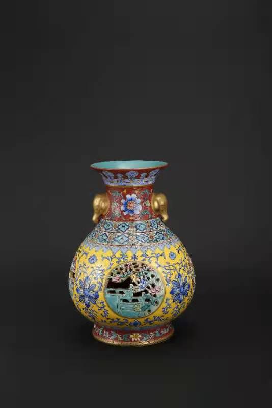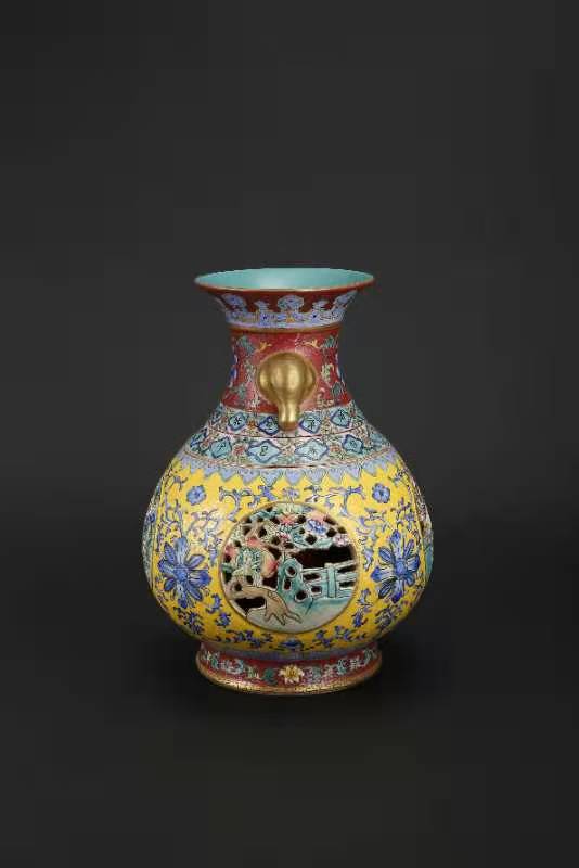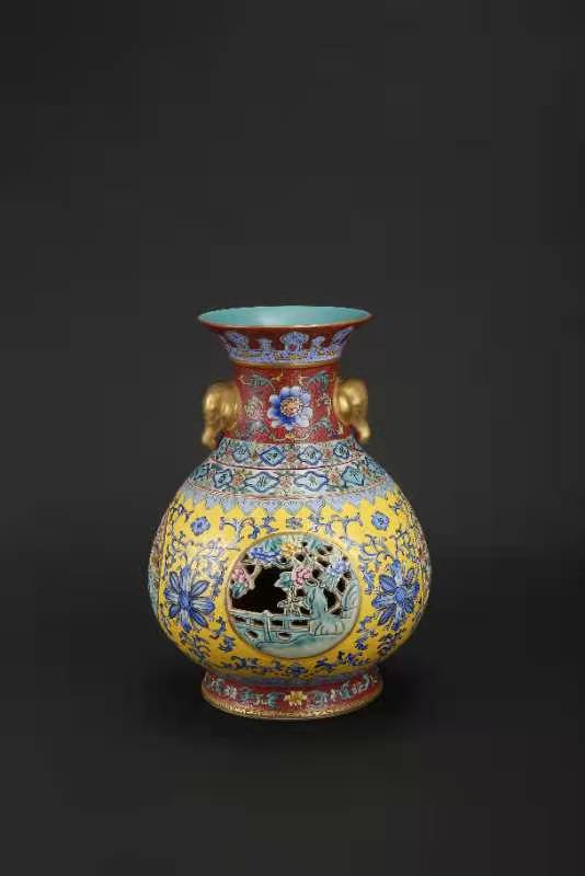 大清乾隆年制,黄地釉轧道、缕空、开光、描金象耳转心瓶。该瓶分三层、工艺制作精致,是带万年历的玲珑转芯瓶。该瓶工艺制作难度极大,成品率很底,投资收藏价值极高。值得大家收藏。该瓶高