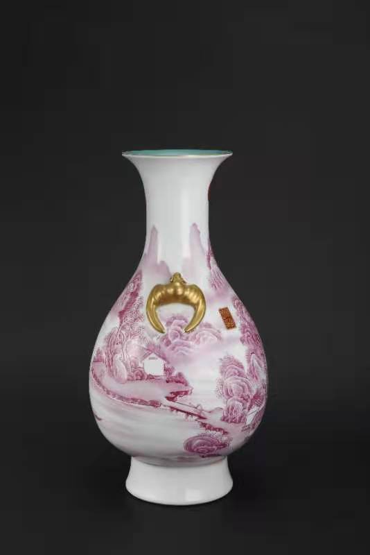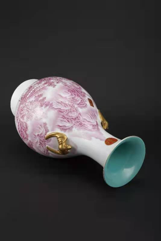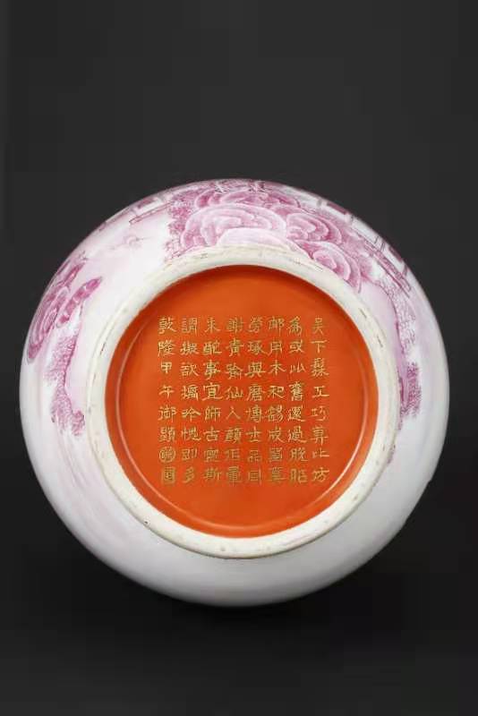 014.大清乾隆年制,胭脂红釉山水人物描金蝠耳尊一件。该尊用描金书写古稀天子、太上皇帝、三希堂精鉴玺、宜子孙、乾隆鉴赏、雅玩珍藏的书画印章,蝙蝠耳、口沿描金、底部用描金书写乾隆御题诗一首。器身白釉地用胭脂红绘山水人物楼阁,是件非常珍贵的文物,值得馆藏。该尊高43.3厘米,口径14厘米,底径14厘米。