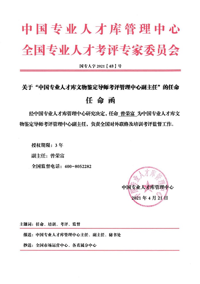 曾荣富(别名:曾圣元)资深文物艺术品鉴定评估师,专家。从小酷爱收藏古玩艺术品,至今收藏35年,主要收藏品以清三代官窑瓷器及唐、宋、元、明、清的官窑瓷器6000余件。收藏以古代名贵字画为主,从东晋、南北朝、隋朝、唐代、宋代、元、明、清及近现代的大师作品,如张大千、徐悲鸿、齐白石、李可染、付抱石等5000余件。珠宝、玉石、翡翠10000余件,明清名贵紫檀、海南黄花家具100余件套。明清福建寿山石、田黄100余件套。长期从事文物艺术品的保护研究和投资收藏。